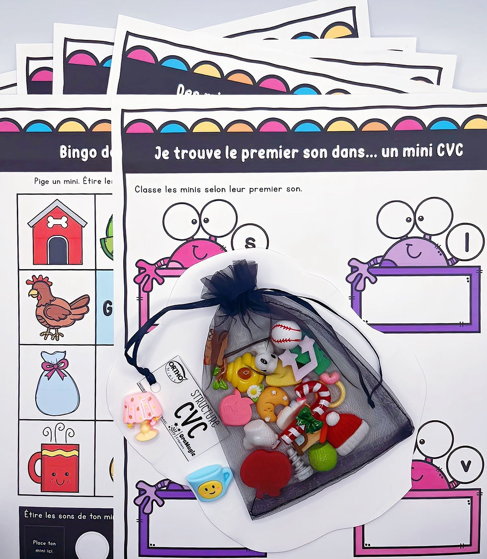 Les ensembles de cette section aident l’enfant à manipuler les sons du langage de façon ludique. Ces habiletés sont essentielles, car elles préparent directement à l’apprentissage de la lecture et de l’écriture.